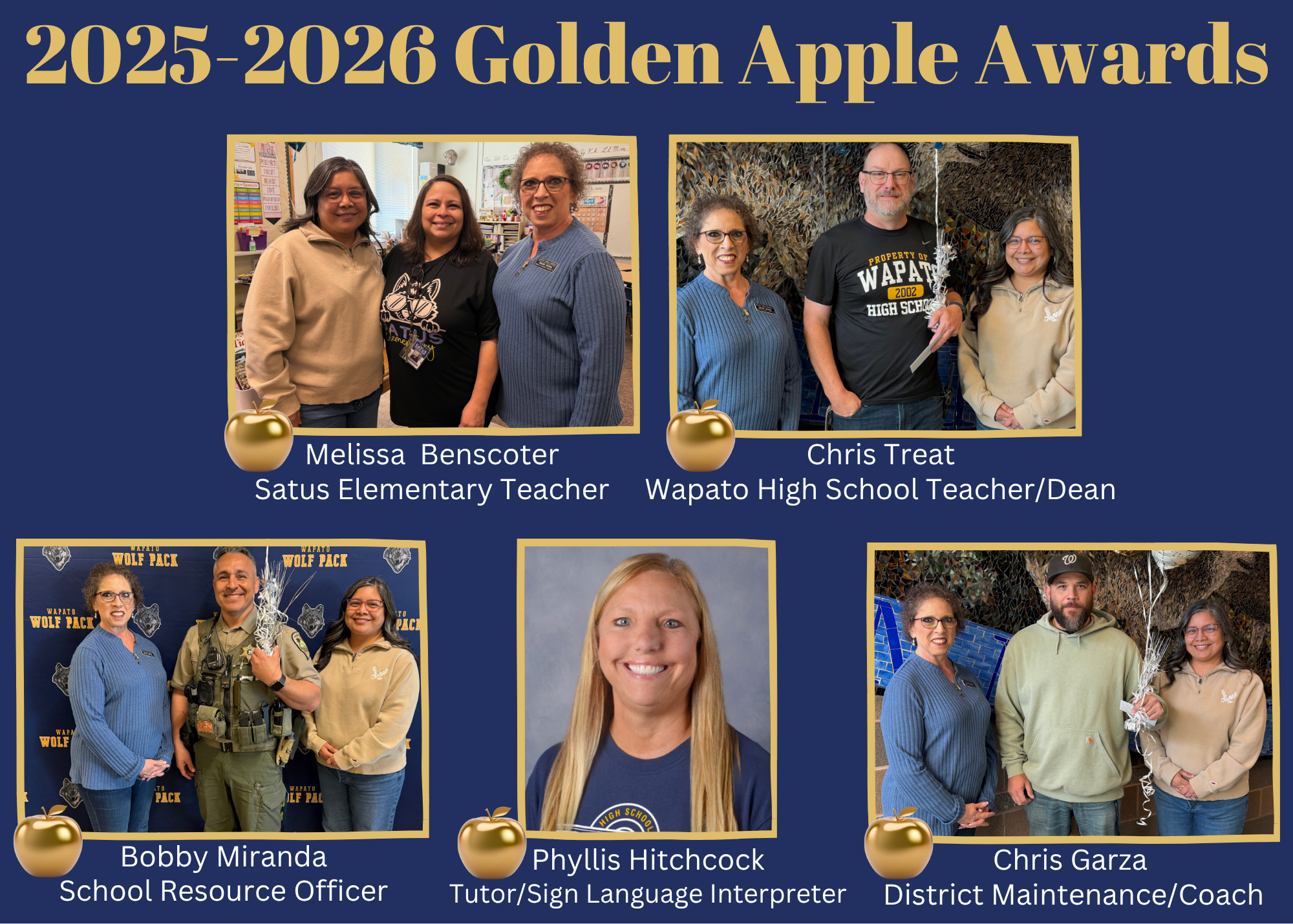 Congratulations to the 2026 Golden Apple Award recipients! They include Melissa Benscoter-Satus Elementary, Chris Treat-Wapato High School, Phyllis Hitchcock-District Sign Language Interpreter/Tuto...